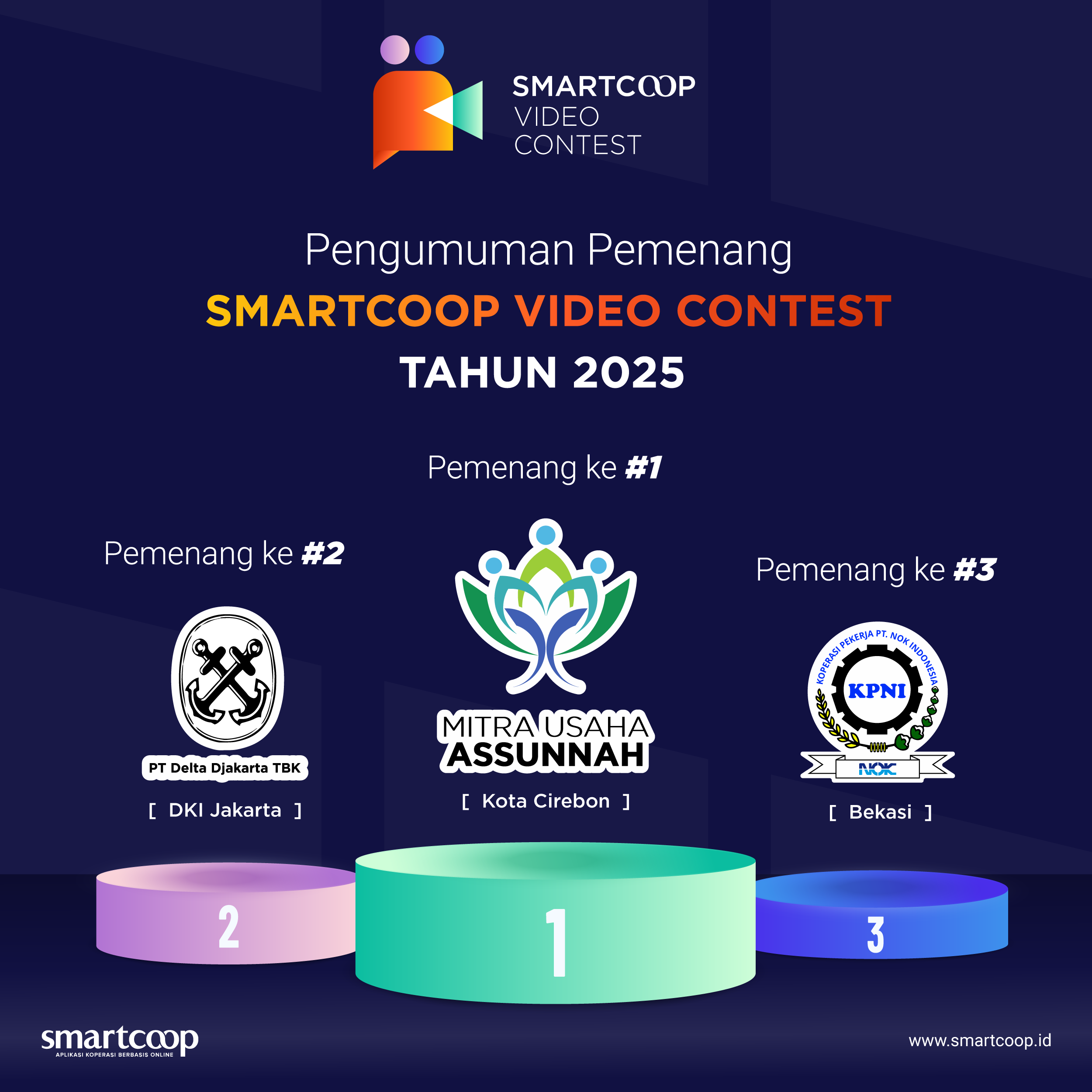 Smartcoop Video Contest ke 1 di tahun 2025 ini telah berhasil mendapatkan 3 pemenang terbaik, setelah satu bulan dilakukan screening, seleksi dan penilaian, maka juri yang terdiri dari : Bpk Dr.Ir. Cahyana Ahmadjayadi (Advisor Senior Smartcoop), Ibu RE Fajar Siswantari, Sip (Komisaris PT Vision Media Creative) dan 5 Juri dari internal Smartcoop. maka hasil penilaian untuk Video Terbaik pada gelarang Smartcoop Video Contest ke 1 tahun 2025 ini jatuh kepada  :